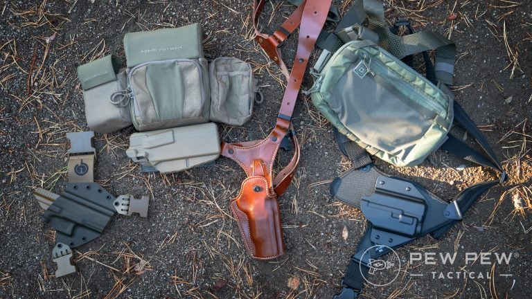 There are times when it’s nice to conceal a pistol on your chest, though. The 5.11 Tactical Skyweight Utility Chest pack will do that on its own. The Alien Gear Cloak and Gunfighters Inc. Kenai are easy enough to conceal under a thick flannel or light jacket (depending on your pistol).