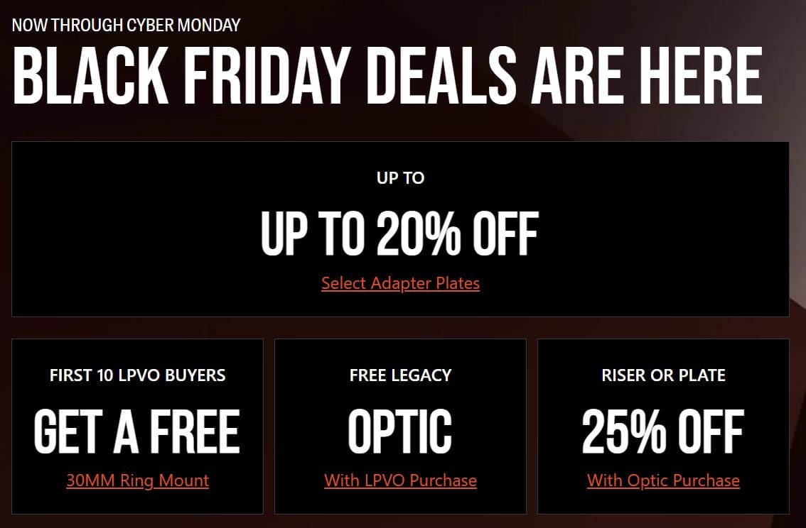You can still find some BF deals on several websites. Check Primary Arms, Brownells, PSA...