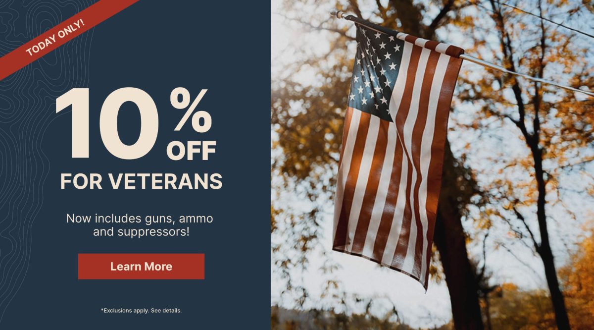 10% off for Veterans (includes guns, suppressors, ammo…)